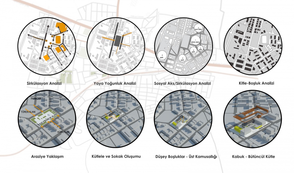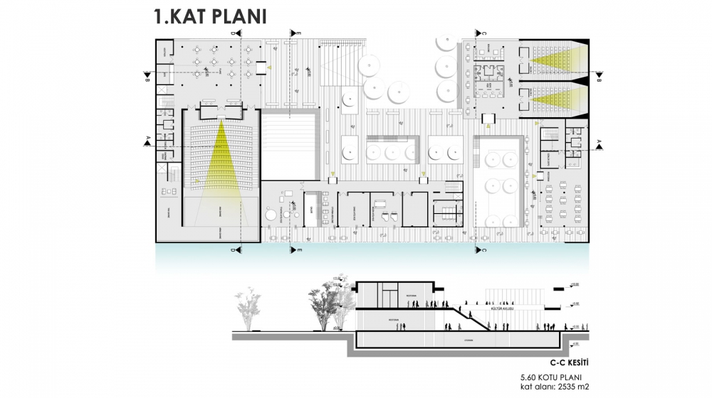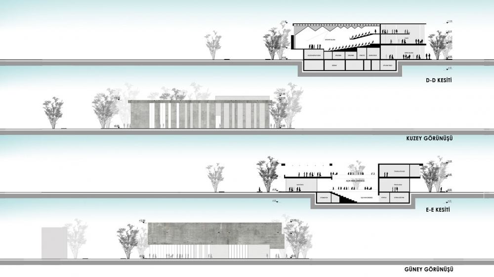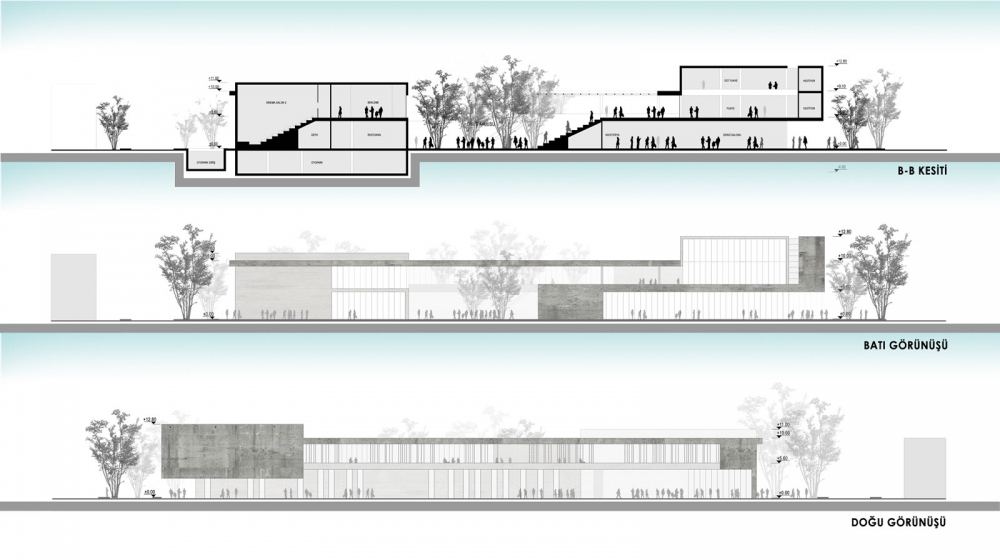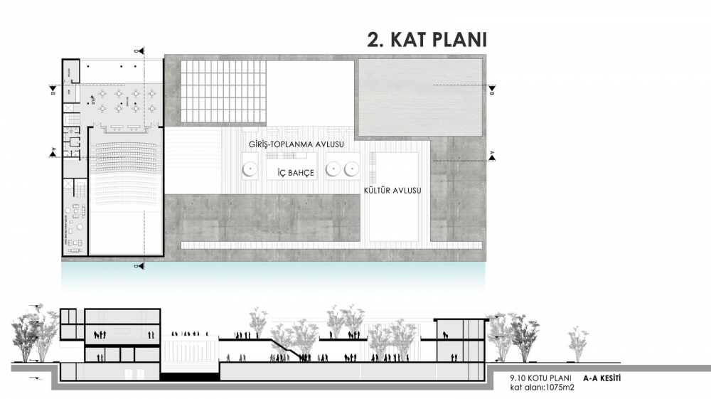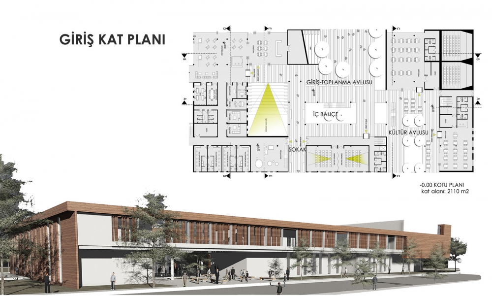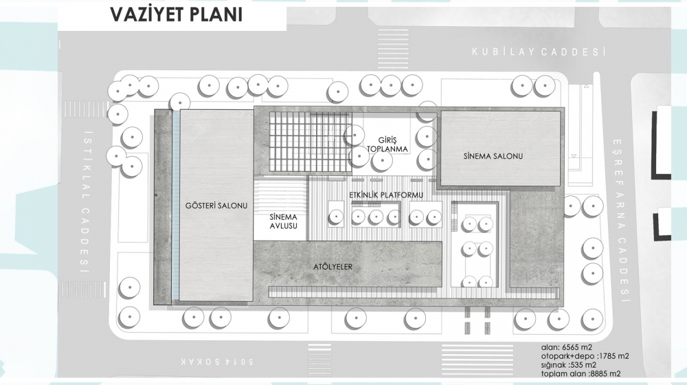 İlçe içindeki boşluklara referans veren kütle amfi, saçak ve üst örtüyle ana arter olan Kubilay Caddesine bakarken; kent balkonu, avlu ve platform gibi mimari elemanlarla çevredeki konut dokusu içerisindeki potansiyeli açık alanlara bakmaktadır. Yapı zemin ve 1. kat seviyesinden boşaltmalar yapılarak çevreyle ilişkilenme potansiyeli arttırıldı. Restoran, sinema, atölye, gösteri salonu gibi kamusallığı arttıran etkinlik mekânları peyzaj ve üst platformlara açılarak alanın kamusallığını arttırmıştır. Zeminde oluşturulan peyzaj üst kotlara da taşınarak yapı içerisinde yeşil dokulu etkinlik alanları oluşturuldu.